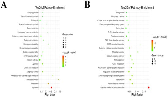 The KEGG pathway enrichment analysis. (A) The KEGG pathway enrichment analysis of up-regulated genes. (B) The KEGG pathway enrichment analysis of down-regulated genes.