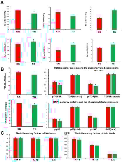 Antioxidant capacity and inflammatory factors expressed in the mammary gland. Proteins expressions were detected with ELISA kits. RT-qPCR was used to verify mRNA expression. GAPDH was used as a control. (A) The measurement of oxidative damage and antioxidant capacity. (B) The detection of TGF-β-associated inflammatory signaling pathway. (C) The proteins expressions of TNF-α, IL-1β and IL-6. CG, control group, milk duct perfusion with 6 mg/kg normal saline. TG, tea polyphenols group, milk duct perfusion 6 mg/kg tea polyphenols. The asterisk represents the comparison with CG, and p < 0.05 is significantly different from CG. The experimental data represent the mean ± SD of three independent experiments.