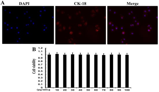 Positive expression of CK-18 is evidence of an epithelial lineage. CK-18 immunofluorescence was used for cell identification. The results showed that CK-18 was highly expressed in MAC-T cells (Figure 5A), which proved that MAC-T cells were mammary epithelial cells. CCK-8 assay was used to verify the cell viability of TPs. The results show that 20, 40 and 60 mg/mL of TPs had no significant effect on cell survival. TPs at 10, 30, 50, 70, 80, 90 and 100 mg/mL had a slight effect on cell survival but the difference was not significant (Figure 5B). Therefore, it could be inferred that TPs in this range of doses had no cytotoxicity.