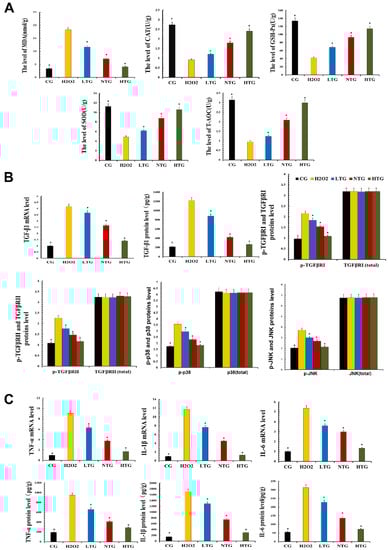 Oxidative stress and inflammatory response in MAC-T cells. Proteins’ expressions were detected with ELISA kits. RT-qPCR was used to verify mRNA expression. GAPDH was used as a control. (A) The measurement of oxidative damage and antioxidant capacity. (B) The expression of TGF-β1 mRNA and protein and the expression of proteins of the TGF-β signaling inflammatory signaling pathway. (C) The mRNA and protein expressions of inflammatory cytokines. CG, control group, the cells were routinely cultured. H2O2, hydrogen peroxide stimulation group. LTG, H2O2 + 20 μg/mL tea polyphenols treatment group. NTG, H2O2 + 40 μg/mL tea polyphenols treatment group. HTG, H2O2 + 60 μg/mL tea polyphenols treatment group. The asterisk represents the comparison with H2O2, and p < 0.05 is significantly different from H2O2. The experimental data represent the mean ± SD of three independent experiments.