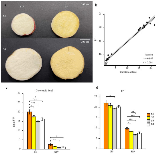 Analyses of sweet potato storage root phenotypic characteristics and carotenoid content. (a) Storage root phenotypes were assessed for BS-S2, BS-S4, S19-S2, and S19-S4 samples. Scale bar = 200 μm. (b) Correlations between carotenoid content and color change. (c,d) Total carotenoid content (c) and color change (d) were analyzed in both sweet potato types at the analyzed time points. Data are means ± SEM (n = 3). *** p < 0.001, ** p < 0.01, * p < 0.05.