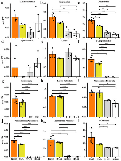 Analysis of carotenoid levels in sweet potato samples. The content of lutein (a–g), carotenoid esters (h–k), and carotene (l). Data are means ± SEM (n = 3). *** p < 0.001, ** p < 0.01, * p < 0.05.
