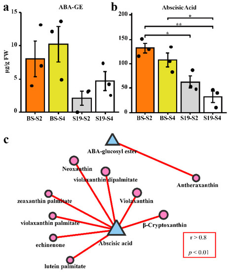 ABA metabolism and its relationship with carotenoids in sweet potatoes were examined by using LC-MS/MS. Opposing trends in ABA and ABA-glucosyl ester (ABA-GE) content were observed in these storage roots, with ABA-GE levels trending upwards over the course of development in both sweet potato types, while ABA levels trended downwards. Total ABA content was significantly higher in BS storage roots than S19 storage roots (Figure 3a,b). As shown in Figure 3c, changes in the ABA content of these two sweet potato types were positively correlated with the observed trends in most carotenoid compositions. However, the change trend of ABA-GE content was only related to that of antheraxanthin content (Figure 3c).
