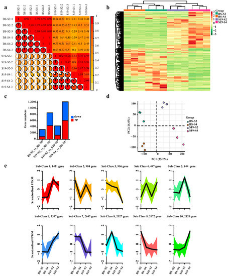 DESeq2 was next used to identify differentially expressed genes (DEGs) in BS and S19 samples at these different stages of development (|log2FC| ≥ 1, FDR < 0.05). PCA and cluster analyses revealed close clustering of biological replicate samples, with clear distinctions between samples from different groups (Figure 4a–c). In total, these analyses identified 8643 (4470 upregulated and 4173 downregulated), 12,212 (6154 upregulated and 6058 downregulated), 3298 (983 upregulated and 2315 downregulated), and 4409 (1391 upregulated and 3018 downregulated) DEGs for the respective S19-S2_vs_BS-S2, S19-S4_vs_BS-S4, BS-S2_vs_BS-S4, and S19-S2_vs_S19-S4 comparisons (Figure 4d). In total, 10 subset classes were clustered based on DEG expression patterns (Figure 4e).