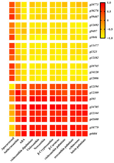 PSY (g29616) expression in BS has been shown to be significantly upregulated relative to levels in S19 storage roots at the S2 and S4 stages. CHYB expression in the storage roots of these sweet potato types trended downward from the S2 to the S4 stage, with CHYB gene (g1548 and g953) expression levels in BS storage roots that were 3.56-, 3.85-, and 2.52-, 2.59-fold higher than those in the S19 storage root at the analyzed stages of development. Relative to BS storage roots, lower levels of ZEP (g41700) expression were evident in S19 storage roots, particularly during the S2 stage. However, ZEP genes (g14444 and g1103) were expressed at very high levels in S19 samples, with opposing expression trends during different stages of development. CCD gene (g49586) expression was significantly increased in BS storage roots at the analyzed stages of development, as compared to those from S19 sweet potatoes. Relative NCED3 (g36276) expression was increased by 34.09- and 39.74-fold in S19 storage roots during the respective S2 and S4 stages relative to levels in BS storage roots. Moreover, 8 ABA metabolism-associated DEGs were identified, including 14 ABA2 (xanthoxin dehydrogenase) and 5 CYP707A (abscisic acid 8’-hydroxylase). Downregulated expression of the ABA2 gene was observed over the course of development, with significantly lower ABA2 (g34785) expression in S19 storage roots relative to those from BS sweet potatoes. The ABA degradation-associated gene CYP707A (g34128) was expressed at 302.20- and 59.31-fold higher levels in S19 storage roots relative to BS storage roots at the S2 and S4 stages, respectively. Three key ABA2 genes (g4684, g34785, and g41600) were also significantly positively correlated with ABA content (Figure 6). These DEGs may be associated with the observed differences in carotenoid metabolic activity in the BS and S19 types, and with differences in the levels of detected DAMS. β-carotene (C02094), β-cryptoxanthin (C08591), antheraxanthin (C08579), violaxanthin (C08614), neoxanthin (C13431), ABA (C06082), and ABA-GE (C15970) were detected (Figure 5, Table S5).