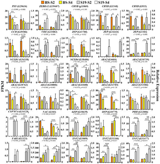 Expression analyses of structural genes and transcription factors associated with the carotenoid and ABA biosynthesis pathways. Data are means ± SEM (n = 3). *** p < 0.001, ** p < 0.01, * p < 0.05.