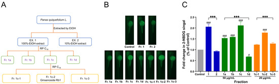 Bioguided separation of the active ingredients in American ginseng. (A) Scheme of bioguided fractionation. (B,C) Fluorescence microscopy images of zebrafish larvae after treatment with different fractions and the fold change in absorption of 2-NBDG quantified by Image J. Blue, green and orange are three different batches. Results are expressed as mean ± SEM. ### p < 0.001, # p < 0.05 vs. control. *** p < 0.001.