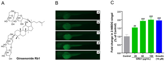 GRb1 induces 2-NBDG uptake in zebrafish larvae. (A) Chemical structures of ginsenoside Rb1. (B) Fluorescence microscopy images of zebrafish larvae treated with different concentrations of GRb1 (20, 60, 100 μg/mL) with 10 μM emodin as a positive control. Control (a), 20 μg/mL GRb1 (b), 60 μg/mL GRb1 (c), 100 μg/mL GRb1 (d) and 10 μM emodin (e). (C) Fold change in 2-NBDG absorption quantified by Image J. Results are expressed as mean ± SEM. ### p < 0.001, ## p < 0.01 vs. control.
