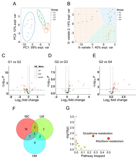 LC-MS data were analyzed and processed according to the procedure flow we previously reported [14,15]. In brief, the raw data files were imported into MS-Dial (version 4.7.0) for peak detection, MS2 deconvolution, metabolites identification, and peak alignment. The metabolites were identified by comparing MS1 and MS/MS with the MS-Dial public MSP database (VS15), whose items was washed and limited to those KEGG compounds with biological roles (br08001). In the compound annotation, the m/z tolerance was set with 2 mDa t for MS1 and 5 mDa for MS/MS data. Then, principal component analysis (PCA) and partial least squares discriminant analysis (PLS-DA) were performed and visualized using the Bioconductor package mixOmics in R language. The fold change (FC) was measured based on the normalized peak area. The p-value was calculated using the t test function in R. Volcano and Venn plots were plotted using the R package. Differential metabolites were filtered by a threshold of FC > 1.2 and p < 0.02. Metabolite pathway enrichment were performed using Metaboanalyst online tools (version 5.0) and the Bioconductor package FELLA (version 1.14) [16].