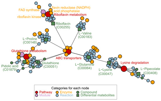The apparent changes in the expression of differential metabolites across the comparison groups indicated that their metabolic pathways were significantly implicated. This may be due to the protective effect of GRb1 against diabetes in zebrafish larvae. To better understand how metabolite alterations are induced by GRb1 administration, we carried out pathway enrichment using the online toolkit Metaboanalyst 5.0 (accessed on 10 January 2022) to explore and visualize the metabolic pathways influenced by GRb1. Figure 3G shows the pathway enrichment results for 14 metabolites that were significantly changed after GRb1 (100 µg/mL and 200 µg/mL) treatment in diabetes zebrafish. As shown in Figure 3G, the size of the bubbles is positively correlated with the size of the pathway impact factor, and the color of the bubbles reflects p-value of the enrichment analysis. Darker colors represent smaller p values, meaning more significant enrichment. Six metabolic pathways were regulated after GRb1 treatment, including glutathione metabolism, riboflavin metabolism, purine metabolism, sphingolipid metabolism, alanine, aspartate and glutamate metabolism, arginine and proline metabolism. All the enrichment data, including p-values and impact values, are listed in Table 1. Our results indicated that GRb1 had a more significant effect on glutathione metabolism and riboflavin metabolism, especially riboflavin metabolism. In addition, we mapped the metabolic pathway network (Figure 4) using FELLA to facilitate a clearer view of the overall affected pathways and the corresponding vital metabolites.