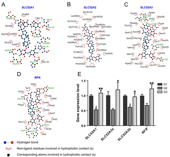Verification of the role of GRb1 in riboflavin metabolic pathway. (A–D) Ligplot + results for schematic ligand interactions of 4 proteins related to riboflavin metabolic pathway with GRb1 showing hydrogen bonding and hydrophobic interactions. (E) Expression of the mRNA of the proteins related to riboflavin metabolic pathway in larvae after GRb1 treatment. Results are expressed as mean ± SEM, n = 3 per group. # p < 0.05 vs. G1. ** p < 0.01, * p < 0.05 vs. G2. G1, larvae exposed in E3 water; G2, larvae treated with 4% glucose; G3, larvae treated with 4% glucose + 100 μg/mL GRb1.