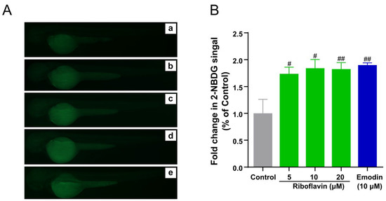Riboflavin induces 2-NBDG uptake in zebrafish larvae. (A) Fluorescence microscopy images of zebrafish larvae treated with different concentrations of riboflavin (5, 10, 20 μM) with 10 μM emodin as a positive control. Control (a), 5 μM riboflavin (b), 10 μM riboflavin (c), 20 μM riboflavin (d) and 10 μM emodin (e). (B) Fold change in 2-NBDG absorption quantified by Image J. Results are expressed as mean ± SEM. ## p < 0.01, # p < 0.05 vs. control.