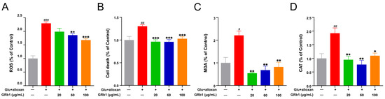 It is well known that riboflavin, the significant component of the flavoenzymes cofactor, is involved in redox reactions and energy metabolism in vivo, mainly through the respiratory chain in the form of FMN and FAD [22]. Riboflavin deficiency can cause oxidative stress [23]. Chronic hyperglycemia can induce oxidative stress and increase ROS in the body, resulting in oxidative damage to various cells, tissues, and organs [24]. Firstly, to determine whether GRb1 may regulate redox status in the diabetes model, we evaluated the influence of GRb1 treatment on ROS production, cell death, MDA levels, and CAT activity changes in diabetes larvae. As shown in Figure 7 and Figure S4, diabetes larvae showed a significant increase in ROS, cell death, MDA levels and CAT activity. GRb1 treatment significantly reduced ROS, cell death, MDA levels and CAT activity in diabetes larvae. These results demonstrated that GRb1 restored redox homeostasis in the diabetes larvae.