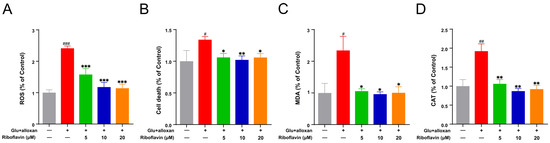 Riboflavin supplementation attenuates oxidative stress in a diabetes zebrafish model. ROS production ((A), cell death (B), MDA levels (C) and CAT activity (D) in diabetic zebrafish larvae treated with different concentrations of riboflavin. Results are expressed as mean ± SEM. ### p < 0.001, ## p < 0.01, # p < 0.05 vs. control. *** p < 0.001, ** p < 0.01, * p < 0.05 vs. model.