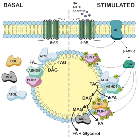 - Wang, H.; Hu, L.; Dalen, K.; Dorward, H.; Marcinkiewicz, A.; Russell, D.; Gong, D.; Londos, C.; Yamaguchi, T.; Holm, C.; et al. Activation of Hormone-Sensitive Lipase Requires Two Steps, Protein Phosphorylation and Binding to the PAT-1 Domain of Lipid Droplet Coat Proteins. J. Biol. Chem. 2009, 284, 32116–32125. [Google Scholar] [CrossRef] [PubMed]