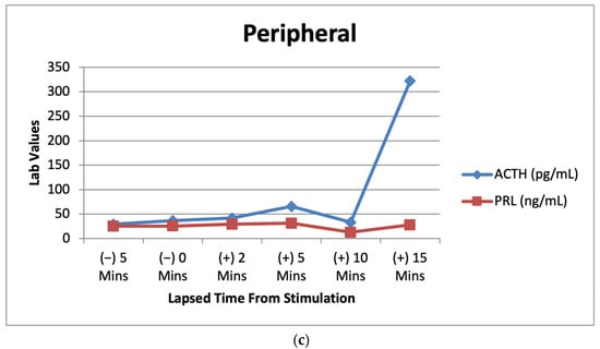 (a) Right IPS venous sampling values for ACTH and prolactin after CRH stimulation over multiple time intervals. (b) Left IPS venous sampling values for ACTH and prolactin after CRH stimulation over multiple time intervals. (c) Peripheral sampling values for ACTH and prolactin after CRH stimulation over multiple time intervals.