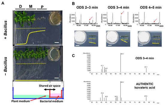 In this study, we identify a novel mode of plant–microbe interaction between A. thaliana (Col-0) and B. atrophaeus Nakamura ATCC9372 (renamed from B. subtilis, ATCC9372) through BVOCs that trigger growth inhibition. We conducted activity-guided purification of the volatile compounds from the B. atrophaeus cells and identified that isovaleric acid is a key molecule that is able to induce plant growth alterations among a blend of BVOCs released from B. atrophaeus. Our results highlight the biological importance of isovaleric acid as a novel plant growth regulator and give insight into how plants and soil bacteria achieve interkingdom signaling through BVOCs that are ubiquitously expressed throughout bacterial species.
