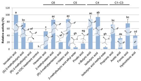 Structure–activity relationship of IVA and its analogs. Various structural analogs of IVA were subjected to the bioassay for detecting plant growth-inhibiting activity by monitoring the inhibition of seminal root elongation. The inhibitory activity of seminal root elongation exhibited by each chemical was evaluated after 5 days of incubation and presented as values relative to that of isovaleric acid. It is notable that (R)-2-methylbutyric acid showed significantly lower activity of plant growth inhibition compared with (S)-(+)-2-methylbutyric acid, which is one of the two major BVOCs among Bacillus BVOCs. C1–C6 represents the number of carbon atoms in the main chain length of each compound. Mean values (± SD) of the plant growth inhibition activity of each standard chemical that are represented as the relative activity to that of IVA. Different letters indicate significant differences according to Tukey’s means comparison test (p ≤ 0.01). The error bars represent the SD. (n = 3).