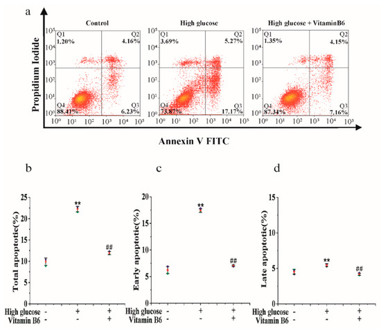 Vitamin B6 protected cells from apoptosis induced by high glucose. (a) Apoptosis rates of RIN-m5F cells cultured with or without 20 μM glucose or with 20 μM vitamin B6 plus 20 μM glucose for 36 h were measured by flow cytometry. (b–d) Cells were treated as described in (a), and total apoptosis, late apoptosis, and early apoptosis were analyzed. The experiment was repeated at least three times (Error bars, s.d ** p < 0.01 indicates significant differences compared with the control group by one-way ANOVA. ## p < 0.01 indicates significant differences compared to the high glucose-treated group by one-way ANOVA.