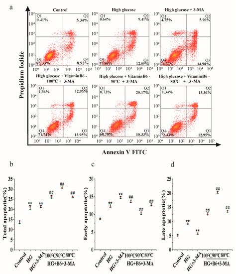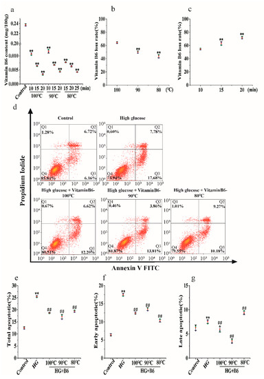 Vitamin B6 reduced the total apoptosis rate of RIN-m5F cells from 25.46% to 18.82%, 17.67%, or 19.45% (Figure 2e). Hydrothermal processing of vitamin B6 at 90 °C or 80 °C also reduced apoptosis induced by high glucose. There was no difference between the groups treated with processed vitamin B6 and those treated with unprocessed vitamin B6 (Figure 2d–g).