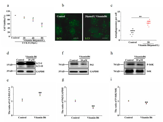 The cell survival rate of the group treated with 20 μM vitamin B6 showed no significant difference from the control group. In contrast, the cell survival rate was lower in the groups treated with 40 μM or 80 μM vitamin B6. Therefore, it can be concluded that 20 μM vitamin B6 had no effect on cell survival (Figure 3a). Microtubule-associated protein 1 light chain 3 (LC3) is a marker protein of autophagy. Cytoplasmic microtubule associated protein 1 light chain 3 alpha (LC3-I) is converted to microtubule associated protein 1 light chain 3 beta (LC3-II) and bound to the autophagic membrane when autophagy is promoted. The number of LC3-positive puncta and the LC3-II/LC3-I ratio were used to evaluate the degree of autophagy. To investigate the effects of vitamin B6 on autophagy, cells were treated with vitamin B6, and the number of autophagosomes was determined by immunofluorescence staining. The data showed that the number of autophagosomes was increased in the group treated with 20 μM vitamin B6 (Figure 3b,c). The LC3-II/LC3-I ratio was also significantly higher in the vitamin B6-treated group than in the control group (Figure 3d,e). Sequetosome 1 (p62) is a substrate protein that is specifically degraded during autophagy. Vitamin B6 significantly decreased the protein expression of p62, which is specifically degraded during autophagy (Figure 3f,g). mTOR is a negative regulator of autophagy [22]. The phosphorylation level of the substrate protein p70 ribosomal protein S6 kinase (p70S6K) may reflect the activity of mTOR, and the decrease in the phosphorylation level of p70S6K indicates that the activity of mTOR was inhibited [23]. Our results showed that vitamin B6 inhibited the phosphorylation of p70S6K (Figure 3h,i). From the above data, it can be concluded that vitamin B6 can induce autophagy under normal culture conditions.