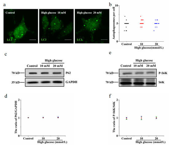 High glucose had no effect on autophagy in RIN-m5F cells. (a) Cells were cultured with 10 or 20 mM glucose for 36 h and stained with anti-LC3 antibody. (b) Cells were treated as described in (a), the number of autophagosomes per cell was calculated, and at least 30 cells were counted by t-test analysis. The experiment was repeated at least three times. (c,e) Cells were cultured as described in (a), and Western blotting was performed to test the expression of autophagy-related proteins with specific antibodies, such as anti-p62, anti-S6K, p70S6K, anti-LC3, and anti-GAPDH. (d,f) The P62/GAPDH and pS6K/S6K ratios in (c,e), respectively, were analyzed by IOD using Image-Pro Plus 6.0 software (Error bars, SD).