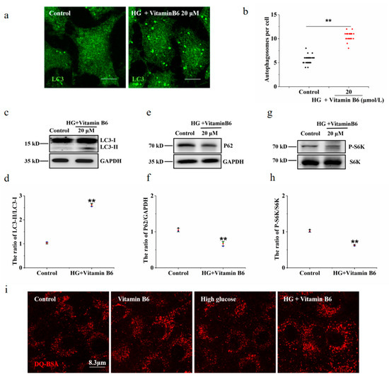 Vitamin B6 induced autophagy under high glucose stress. (a) Cells were treated with or without 20 μM vitamin B6 plus 20 mM glucose (HG) for 36 h, and the number of autophagosomes was assayed by immunofluorescence analysis. (b) Cells were treated as described in (a), mathematical statistics were performed to calculate the number of autophagosomes per cell, and at least 30 cells were counted by t-test analysis. The experiment was repeated at least three times. (c,e,g) Cells were treated as described in (a), and Western blotting was performed to test the expression of proteins with specific anti-p62, anti-S6K, anti-p70S6K, anti-LC3, and anti-GAPDH antibodies. (d,f,h) The ratio of LC3-II/LC3-I, P62/GAPDH, and pS6K/S6K ratios in (c,e,g), respectively, were analyzed by IOD using Image-Pro Plus 6.0 software (Error bars, SD. ** p < 0.01, indicates significant differences compared with the control group). (i) The cells were treated with or without glucose (HG), with vitamin B6 or with 20 μM glucose (HG) plus vitamin B6 for 36 h. The cells were then incubated with DQ-BSA for 3 h and imaged by confocal microscopy.