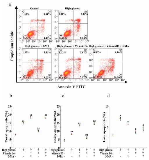 To investigate the mechanism of the inhibition of high glucose-induced apoptosis by vitamin B6, cells were treated with vitamin B6 plus 3-MA under high glucose stress, and the apoptosis rate was tested by flow cytometry. Our data showed that vitamin B6 decreased the total apoptosis rate of islet β cells from 16.13% to 10.20%. 3-MA in combination with vitamin B6 increased the total apoptosis rate from 10.20% to 19.45% compared with the vitamin B6-treated group under high glucose stress (Figure 7a,d). These results suggest that vitamin B6 inhibited high glucose-induced RIN-m5F cell apoptosis, possibly via autophagy.