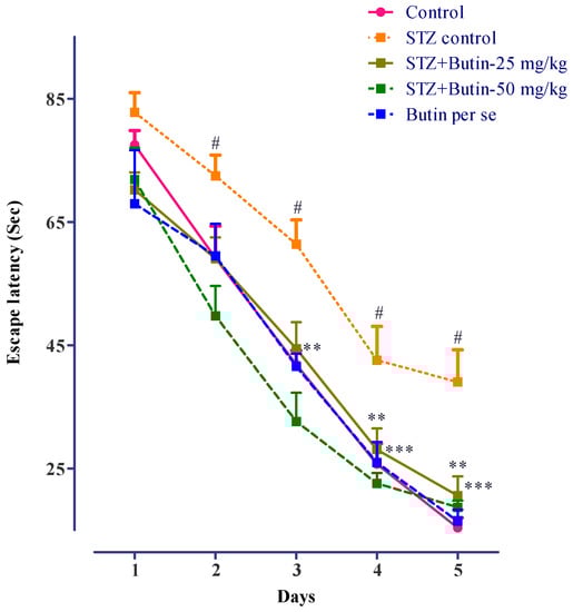 2.3.2. Evaluation of Butin against STZ-Induced Memory Deficit in Diabetic Rats