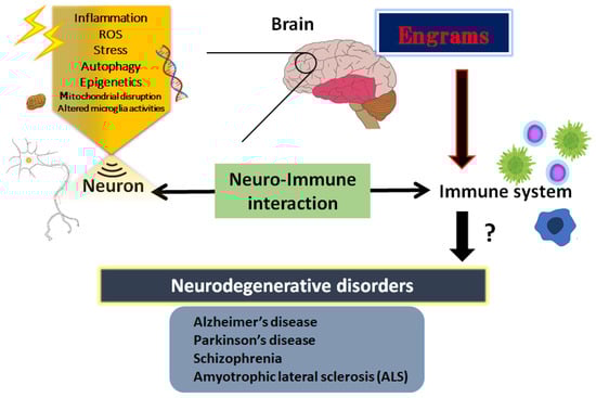 The CNS and the immune system might collaborate on various levels in a body; however, the mechanisms of holding the specific immune-challenge have remained vague. Very lately, it has been clearly shown that the brain keeps the facts of certain inflammation such as inflammatory bowel syndrome occurred in the body [37]. This specific memory seems to be an immunological remembrance called “engrams” [38]. Here, we would like to use this word “engrams” as the meaning of immunological remembrance matching to the meaning of “memory-traces”. The concept of engrams has been fairly hypothetical for the basic units of memory. Now, neuronal assemblies that hold the specific disease engrams have been known in the amygdala, hippocampus, and/or cortex, which may suggest that engrams are distributed among multiple brain regions functionally linking each other as an integrated engrams organization [39]. Associations of these engrams are thought to determine the situation of the host, either of health or disease, by engram arrangements, which may be frequently dependent on several environmental conditions [40]. Consequently, the immunological engrams could restore the initial inflammatory disease condition, if rebooted [38]. Created by stressful and/or repetitive inflammatory occasions, the engrams might commit to a slow progression of chronic diseases including neurodegenerative disorders [41]. Epigenetic changes such as DNA methylation or acetylation within the cells of the neuronal assemblies might be important mechanisms of the engram formation [42], which is also a significant factor for the fine-tuning of the function in the healthy brain [43]. Epigenetics may also stabilize engrams for the effective recovery of fear memory [44]. Therefore, engrams and/or epigenetic changes could be related to the immune consequences in the pathogenesis of various neurodegenerative disorders [45] (Figure 1). The synergistic arrangement of engrams might bring in the solid progression of several diseases, which involves the concept that any complex neurological and/or immunological consequences could result from the interaction of these engrams with immunity. Additionally, frequent subtle immune challenges might result in the stable formation of multiple engrams positioning independent information [46]. Synaptic variations might validate the specific development of engrams during memorizing for supporting memory. Maintenance of the memory might be achieved by a meta-plasticity mechanism that raises the change in neurons within an engram, which may be further encouraged by epigenetic regulators such as histone deacetylases (HDACs) [47]. In fact, the HDACs-related signaling pathways have been significantly associated with the alternative expression of several genes related to neurodegenerative disorders [48]. Consistently, some kinds of epigenetic regulators modified by environmental factors have been suggested as playing a crucial role in the pathogenesis of various neurodegenerative disorders [49]. In short, the brain could hold several specific inflammatory responses as information of pathological neuronal images called “engrams”. This concept could correctly elucidate the pathogenesis of various neurodegenerative disorders and the related CNS disorders, which might contribute to establishing a new strategy for the therapeutic interventions.