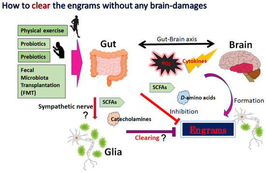 Some engrams could potentially trigger and/or exacerbate the conditions of neurodegenerative disorders [50]. Therefore, clearing the bad memory of “engrams” might be favorable for the prevention and/or treatment of neurodegenerative disorders. In the experiment of dextran sulfate sodium-induced colitis, the authors applied the chemo-genetic procedure of the designer receptor exclusively activated by designer drugs (DREADD) system for the inhibition of engram activity [37]. However, it seems to be impossible to currently use this system in the clinical treatment of humans. Now, is it possible to clear the memory of engrams without neuronal cell death and/or any brain damage? This is the point for therapeutic interventions. In one possible way, synaptic removal could be achieved by microglia capable of initiating the oblivion of memories with engram cells [51]. It is considered that microglia can make synapse elimination a mechanism for forgetting memory retentions [51]. In addition, it has been reported that microglia are related to synapse density, learning, and/or memory [52]. There are significant associations between gut microbiota and demyelination by the microglia in the brain, suggesting that the crosstalk of gut-microbiota and brain-microglia might play a key role for the clearance of engrams [53]. It has been shown that regulation of the microbiota might be connected to the possible therapies of neurodegenerative disorders [54]. A gut–brain axis indicates a bidirectional connection between gut microbiota and brain, which is a vital assembly in the pathophysiology of several neurodegenerative disorders [55]. This concept might include the associations between gut microbiota and more broad CNS disorders. For example, it has been shown that the composition of gut microbiota might be associated with narcolepsy type 1 [56]. Changes in the conformation of gut microbiota may be accepted by the sympathetic vagal afferent nerve transmitting to the CNS via the microglial action, which in turn could produce and/or modulate the responses of engrams. Studies have proven that some species of bacteria could produce catecholamines and/or acetylcholine, which might contribute to the responses of the sympathetic nerve [57]. Some of vagal neurons in the sympathetic pathway usually have an afferent role for the microbiota-mediated adjustment of brain [58]. Convincing evidence has demonstrated the roles of gut microbiota in the pathogenesis of Alzheimer’s disease and/or Parkinson’s disease, which are partly mediated by modified microglial activity in the brain [59]. In fact, microglial dysfunction has been detected in a variety of neurodegenerative disorders including Alzheimer’s disease, Parkinson’s disease and/or ALS [59]. Possibly, the gut-microbiota–glia-brain–immune axis might be influenced by the production of inflammatory cytokines and/or by the reduction of favorable substances such as short-chain fatty acids (SCFAs), modifying the regulation of the sympathetic afferent nerve and glial cells [60]. For example, butyric acid, a key SCFA, might be connected with a favorable response in the treatment of schizophrenia, suggesting an important role in the gut microbiota–brain axis [61]. SCFAs can cross the blood–brain barrier (BBB) and could interact with microglia to regulate their functions [62]. Gut microbiota could also communicate with the brain through intricate communication systems, which incorporate the intestinal function with the cognitive and/or emotional brain via the neuro-immuno-endocrine mediators [63]. At least, some of the potential effectors in the gut could actually stimulate the sympathetic nerve pathway [58]. It has been demonstrated by reproducible and translatable findings that the efficacy of intervention could be achieved with microbial-derived metabolites for modulating the disease progression in ALS [64]. In addition, the impact of gut microbiota on brain function might be also related to brain cognition and/or perception. Therefore, several brain inflammations and/or neurodegeneration in the brain might be related to the action of the gut–brain axis [65], in which the immunity-linked processes might be associated with the neuronal responses to memory engrams [66]. Furthermore, there might be wide-ranging reciprocal connections between gut microbiota and immune-inflammatory responses with engrams, which have a critical significance in the function of the healthy brain and in the pathogenesis of various neurodegenerative disorders [67].