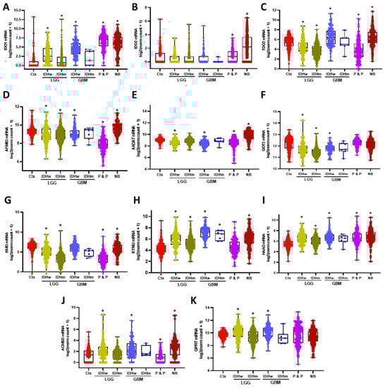Differential gene expression of the KP enzymes among brain tumors. Low grade gliomas (LGG) and glioblastoma (GBM) were separated according to their IDH wildtype (IDHw) or IDH mutant (IDHm) status, then expression levels of the KP enzymes IDO1 (A), IDO2 (B), TDO2 (C), AFMID (D), AADATnaïve (E), GOT2 (F), KMO (G), KYNU (H), HAAO (I), ACMSD (J), and QPRT (K) were compared with non-tumor brain cortex samples (Ctx), pheochromocytomas and paragangliomas (P & P), and neuroblastomas (NB). * p < 0.05 when considering the Dunn’s test for multiple pairwise comparisons against Ctx.