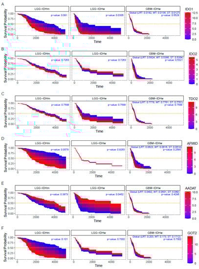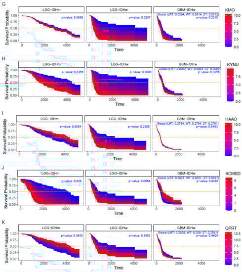 Survival area plots for patients diagnosed with IDHw low-grade glioma (LGG-IDHw), IDHm low-grade glioma (LGG-IDHm), and glioblastoma (GBM-IDHw) according to the expression levels of the kynurenine pathway enzymes. Survival probability of IDO1 (A), IDO2 (B), TDO2 (C), AFMID (D), AADAT (E), GOT2 (F), KMO (G), KYNU (H), HAAO (I), ACMSD (J), QPRT (K). For each KP enzyme, the associated Survival Probability curves are obtained from a Cox proportional hazards regression model.