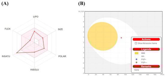 ADMET (absorption, distribution, metabolism, excretion, and toxicity) are the essential measurement tools for any compound before being elected as a drug candidate. The online web tool swiss ADME (http://www.swissadme.ch/index.php accessed on 6 September 2022) was used to obtain the ADME properties of the isolated flavone [43] and the pharmacokinetic scores were predicted using the online web application pkCSM (http://biosig.unimelb.edu.au/pkcsm/prediction accessed on 6 September 2022)