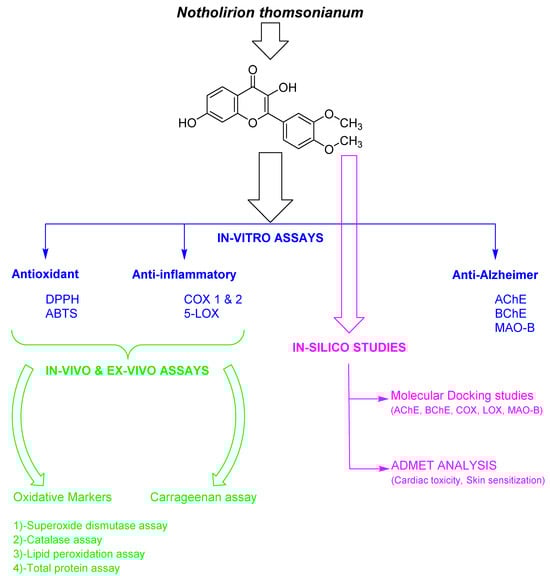 Notholirion thomsnianum (Royale) Stapf, a member of the Liliaceae family, is traditionally used to treat infectious diseases, gastrointestinal disturbances and to treat tumors [26]. We previously validate the plant for its analgesic, antimicrobial and anti-diabetic potential [27,28,29]. The aim of our designed work was to isolate a pure compound (2-(3,4-dimethoxyphenyl)-3,7-dihydroxy-4H-chromen-4-one) from the potent fraction of N. thomsonianum. The isolated compound was subjected to in-vitro cholinesterase inhibitory, MAO-B inhibitory, antioxidant and anti-inflammatory studies. After the in-vitro results, the isolated compound was tested safely in experimental animals and was then subjected to in-vivo anti-inflammatory assay. Furthermore, the isolated compound was evaluated for its effects on in-vivo antioxidant markers including Superoxide Dismutase (SOD), Catalase (CAT) and lipid peroxidation. The molecular docking and ADMET studies were also performed to strengthen our design work.