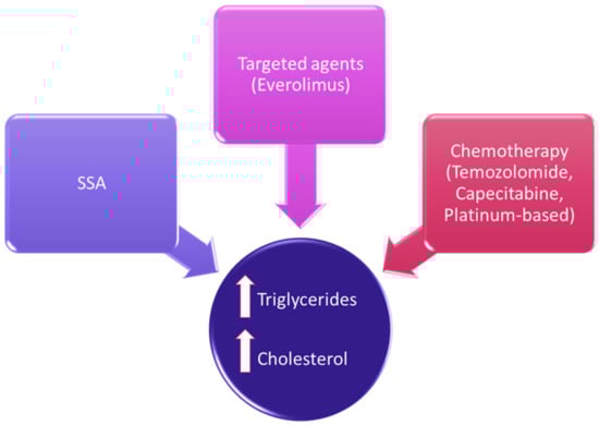 Therapeutic options in NENs have considerably expanded in the last decades, and the evaluation of their safety profile should include lipid homeostasis [12]. Besides a direct effect on lipid metabolism, there could be other indirect effects due to metabolic alterations (Figure 1).