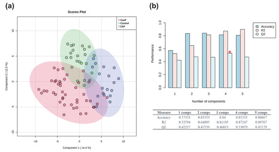 Exploratory multivariate statistical analysis. (a) Partial least square discriminant analysis (PLS-DA) score plot depicting clustering of COVID-19 pneumonia (CovP), control, and non-COVID-19 pneumonia (CAP) samples. (b) Plot obtained after performing a random permutation test with 100 permutations on PLS-DA model. The red asterisk indicates the best classifier (R2 = 0.87, Q2 = 0.53), R2 is the explained variance, and Q2 is the predictive ability of the model. Q2 represents the model’s predictive ability and is calculated by comparing the predicted data with the original data. The calculated prediction error (Predicted Residual Sum of Squares or PRESS) is divided by the initial sum of squares and subtracted from 1. High R2 and Q2 values represent the model’s good predictive ability and confirm our PLS-DA model’s validity. The inset table summarizes Q2, R2, and the accuracy of the best model. Comps mean the number of components.