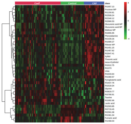 Heatmap of top 40 significantly altered metabolites in group comparison (COVID-19 pneumonia (CovP), control subjects, and non-COVID-19 pneumonia (CAP)) selected after ANOVA (p < 0.05). The colors from green to red indicate the increased concentration (normalized peak area) of metabolites.