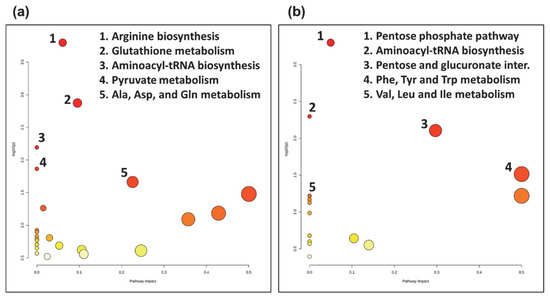 Topology map of altered metabolic pathways describing the impact of metabolites selected from comparative post-hoc analysis (Tukey’s HSD). (a) The top five altered metabolic pathways in the COVID-19 pneumonia (CovP) group. 1. Arginine biosynthesis, 2. Glutathione metabolism, 3. Aminoacyl-tRNA biosynthesis, 4. Pyruvate metabolism, 5. Alanine, aspartate, and glutamate metabolism. (b) The top five altered metabolic pathways in the non-COVID-19 pneumonia (CAP) group. 1. Pentose phosphate pathway, 2. Aminoacyl-tRNA biosynthesis, 3. Pentose and glucuronate interconversions, 4. Phenylalanine, tyrosine, and tryptophan metabolism, 5. Valine, leucine and isoleucine metabolism.