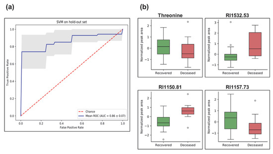 Next, we applied a machine learning approach based on a support vector machine (SVM) to disclose the metabolic signature that can predict the COVID-19 outcome (recovered vs. deceased). Among the 43 COVID-19 patients recruited for this study, 32 recovered and 10 deceased. At first, we applied the synthetic minority oversampling technique (SMOTE) to fit imbalances in the training dataset. Hyperparameter tuning was performed using repeated randomized cross-validation on the SVM classifier with training data. Subsequently, SVM-recursive feature elimination (RFE) was applied to select metabolite features for the classification algorithm. RFE aims to select features by recursively considering smaller and smaller sets of features. Finally, cross-validation was employed to determine an optimal number of features. The SVM classifier was trained on the 10 training datasets to evaluate variability handling with the classifier. We applied receiver operating characteristic (ROC) to evaluate our classification model. The classifier correctly predicted outcomes (recovered vs. deceased) of the COVID-19 subjects with an area under the ROC curve (AUC) of 86 ± 10% (Figure 4a). Box-whisker plots of the concluding four marker metabolites (threonine, RI1532.53, RI1557.73, and RI1150.81) predictive of disease fatality (recovered vs. deceased) in COVID-19 individuals are presented in Figure 4b. In addition, the predictive power of the final model was evaluated via a precision–recall curve. Precision is the ratio of the number of true positives divided by the sum of true positives and false positives, which characterizes the ability of the model to predict the positive samples correctly. It is complemented by the recall metric, which is the ratio of true positives to the actual positives of the data. A perfect model will have a precision and recall of 1 for every chosen threshold. The information of the precision–recall curve is summarized via the AUC metric (Figure S4).
