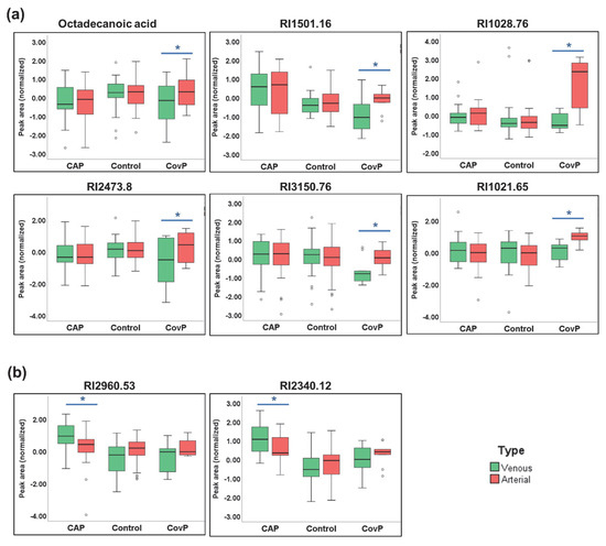 Significant metabolite differences in venous and arterial samples revealed by repeated-measures ANOVA. (a) Box-and-whisker plots of COVID-19 pneumonia (CovP) specific significant metabolic differences in venous (green box) and arterial samples (red box). (b) Box-and-whisker plots of non-COVID-19 pneumonia (CAP) specific significant metabolic differences in venous (green box) and arterial samples (red box). (Asterisk indicates p ≤ 0.05).