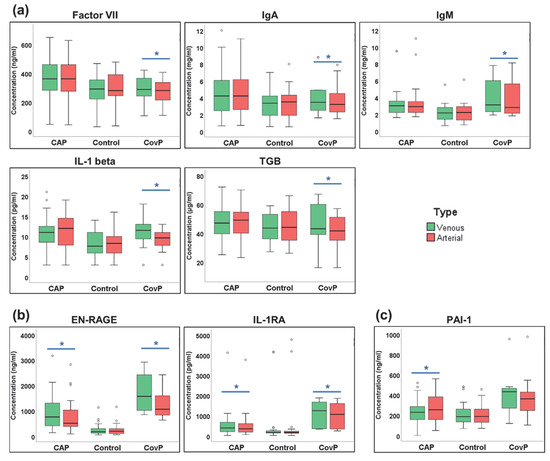 Next, we investigated whether the blood concentrations of cytokines were changed after the passage of the pulmonary circulation (Supplementary Table S4). A paired t-test was employed to compare venous (pre-lung) and arterial (post-lung) samples. Significant differences in Factor VII, IgA, IgM, IL-1beta, and TGB were observed in the COVID-19 group (Figure 6a), while EN-RAGE and IL-1RA showed significant alteration in both COVID-19 and non-COVID-19 pneumonia groups (Figure 6b). PAI-1 levels were significant in the non-COVID-19 pneumonia group (Figure 6c).