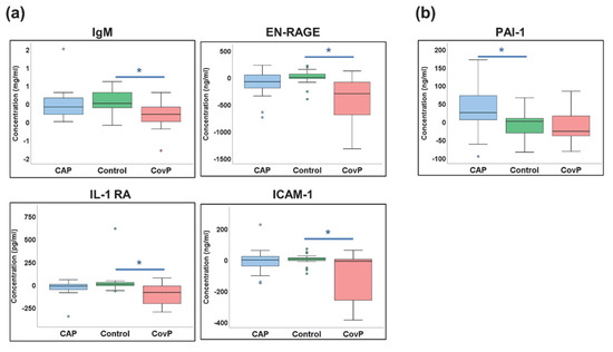 Cytokines with significant differences in the delta values. (a) Box-and-whisker plots of COVID-19 pneumonia (CovP) specific significant differences in delta values as compared to controls. (b) Box-and-whisker plots of both non-COVID-19 pneumonia (CAP) specific significant cytokine differences in delta values as compared to controls. [non-COVID-19 pneumonia (blue box), Control samples (green box), COVID-19 pneumonia (red box), an asterisk indicates p-value ≤ 0.05].