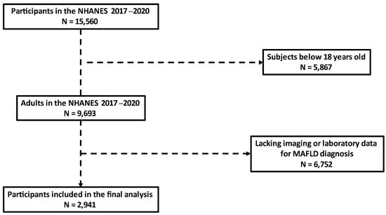 Data were obtained from the NHANES between 2017 and March 2020 pre-pandemic for this study. NHANES databases are cross-sectional surveys conducted by the National Center for Health Statistics (NCHS), providing multitudinous health and nutrition data of the general United States population. A total of 15,560 individuals were enrolled in this study. After the exclusion of subjects below 18 years old (n = 5867) and those missing essential data for MAFLD diagnosis (n = 6752), 2941 participants were finally included in this analysis (Figure 1). This study was reviewed and approved by NCHS Ethics Review Board (protocol numbers #2011-17 and #2018-01). The patients/participants provided their written informed consent to participate in this study.