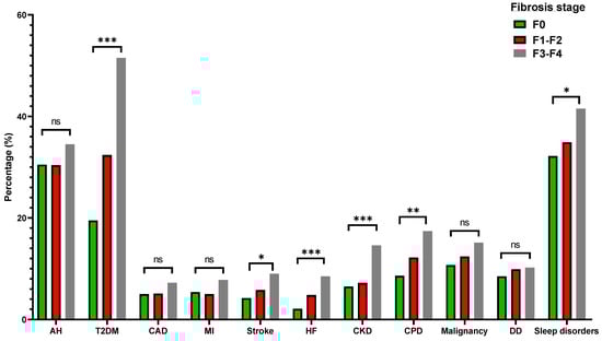 Differences in the prevalence of various pathologic states according to the fibrosis stage in individuals with metabolic dysfunction-associated fatty liver disease (MAFLD). AH: arterial hypertension. T2DM: type 2 diabetes mellitus. CAD: coronary artery disease. MI: myocardial infarction. HF: heart failure. CKD: chronic kidney disease. CPD: chronic pulmonary disease. DD: depressive disorder. ns indicates non-significant difference (p > 0.05), * p < 0.05, ** p < 0.01, *** p < 0.001.