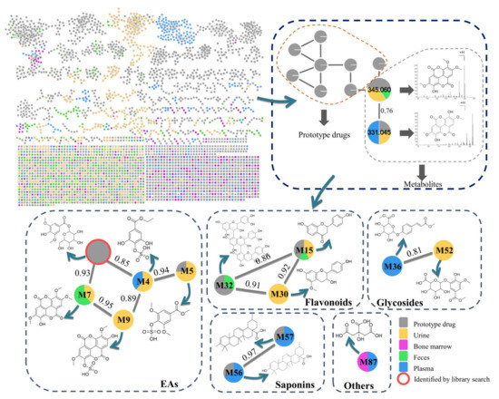 As far as we know, metabolites are structurally similar compounds of prototype ingredients that share the same product ions or neutral loss ions in a collision-induced dissociation. Huan et al. developed a core structure-based search algorithm based on a hypothetical neutral loss for spectral similarity analysis and an unknown metabolite annotation [25]. Hsu et al. developed a strategy based on multiple types of correlated ion information for metabolite identification [26]. To facilitate data analysis, Bandeira et al. developed a molecular network (MN) which was a visualization platform for the analysis of untargeted MS/MS data and it was also a web-based MS data ecosystem [27]. Based on structurally similar compounds or analogs that produce similar fragmentation patterns, MN automatically compares and clusters the spectra of each precursor ion, and the resulting networks are plotted. Compounds from different samples can be marked using different colors, and the relative content of each metabolite can be shown using a pie chart. The compounds are clustered into different families in MN, facilitating the simultaneous characterization of abundant and trace compounds. This method has been successfully employed to analyze antibiotics [28], peptides [29], marine organisms [30,31], and components of HMs [32]. However, the metabolic analysis of HMs using the multifunctional MN has not been reported.