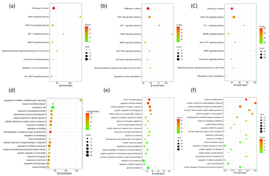 KEGG analysis (a–c) and Gene Ontology (d–f) enrichment analysis of the target proteins of metabolites. Metabolites from plasma (a,d), urine (b,e) and feces (c,f).