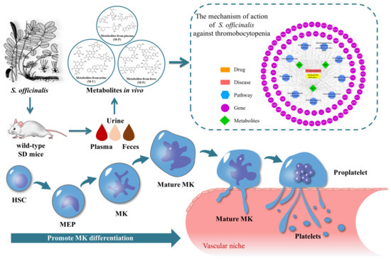 Sanguisorba officinalis L. (SO), a well-known herbal medicine, has been proven to show effect against thrombocytopenia. However, metabolites of SO in vivo are still unclear, and the underlying mechanism of SO against thrombocytopenia from the aspect of metabolites have not been well elucidated. In this study, an improved analytical method combined with UHPLC-QTOF MS and a molecular network was developed for the rapid characterization of metabolites in vivo based on fragmentation patterns. Then, network pharmacology (NP) was used to elucidate the potential mechanism of SO against thrombocytopenia. As a result, a total of 1678 exogenous metabolites were detected in urine, feces, plasma, and bone marrow, in which 104 metabolites were tentatively characterized. These characterized metabolites that originated from plasma, urine, and feces were then imported to the NP analysis. The results showed that the metabolites from plasma, urine, and feces could be responsible for the pharmacological activity against thrombocytopenia by regulating the PI3K-Akt, MAPK, JAK-STAT, VEGF, chemokine, actin cytoskeleton, HIF-1, and pluripotency of stem cells. This study provides a rapid method for metabolite characterization and a new perspective of underlying mechanism study from the aspect of active metabolites in vivo.