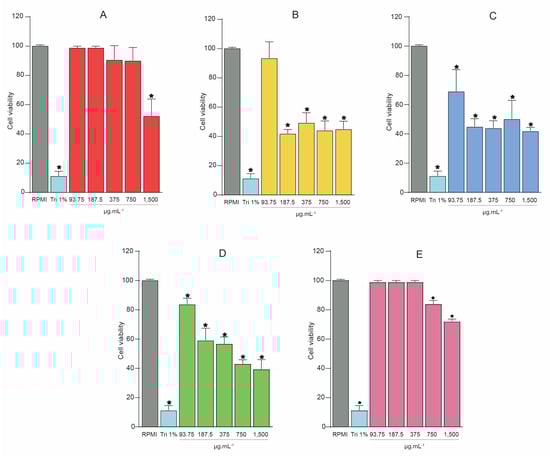 Cell viability was assessed by MTT assays with the extract and its fractions from D. nitidula roots. (A) Ethanolic extract of D. nitidula roots (SREE). (B) Hexane fraction (SREFr1). (C) Dichloromethane fraction (SREFr2). (D) Ethyl acetate fraction (SREFr3). (E) Methanol fraction (SREFr4). Data presented as mean ± SD. (* p < 0.05 extract, its fractions from D. nitidula roots or Triton 1% vs. RPMI control). RPMI: Gibco Roswell Park Memorial Institute 1640 Medium; Tri 1%: Triton X-100 1% (v/v).