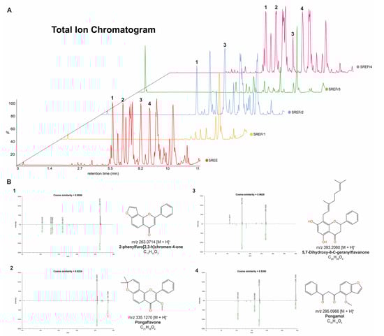 (A) The LC–MS fingerprints of the extract and its fractions from D. nitidula roots. (B) Matches between experimental MS/MS spectra and reference MS/MS spectra from GNPS libraries for the annotated flavonoid derivatives (1–4) in the SREE.B1-B4 in the SREE, SREFr2, and SREFr4 (link to see the mirror plots: https://gnps.ucsd.edu/ProteoSAFe/result.jsp?task=7cfcdd2029174559a7c87182189fc568&view=view_all_annotations_DB (accessed on 7 October 2022)).